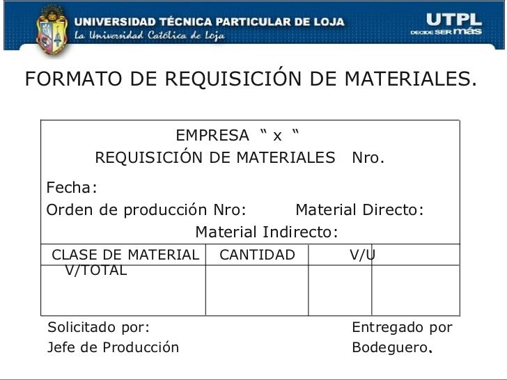Las requisiciones pueden tomar diversas formas de acuerdo con el tamaño y la naturaleza de la empresa. Deben tener el nombre correspondiente o su código, con datos sobre el número, la fecha de entrega, la clase de trabajo en que se aplicarán los materiales, la cantidad, la descripción y el costo unitario, así como las firmas autorizadas del jefe de producción o cualquier otro alto funcionario